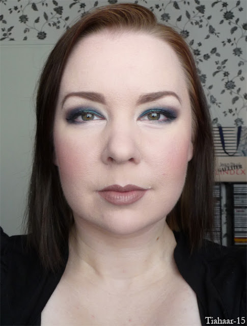 Meikissä on käytetty mustanvihreää varjostukseen (pelkkä mustakin olisi käynyt) ja voimakkaasti hopeista luomiväriä liikkuvalla luomella. Tykkään tehdä alaluomen rajauksista vähän tuollaisia utuisia, koska ne näyttävät vähän kauempaa enemmänkin varjoilta kuin rajauksilta. (Ja alaluomissani alkaa olla sen verran juonteinta, että todella terävät rajaukset eivät vaan enää onnistu niin helposti.)